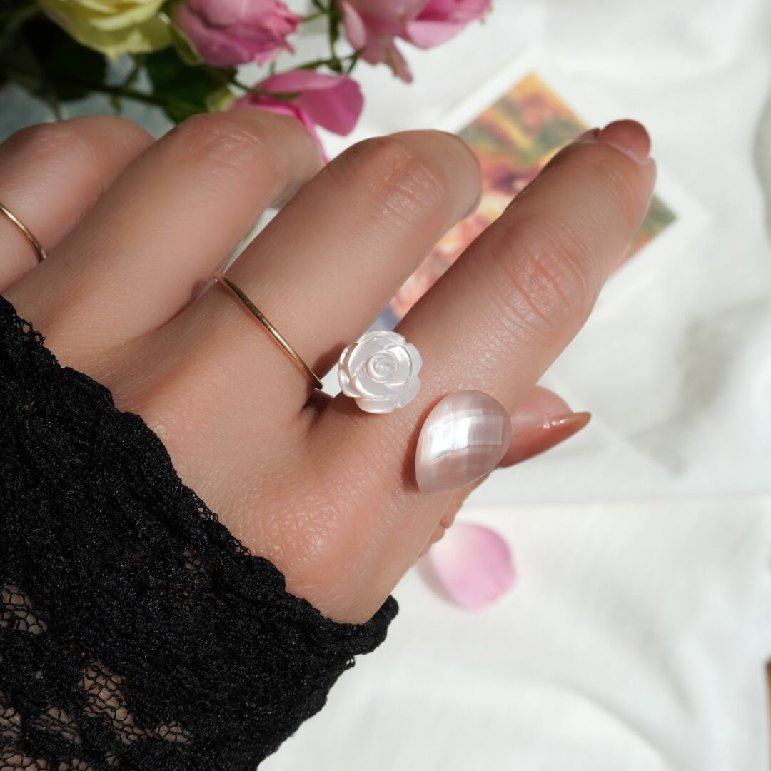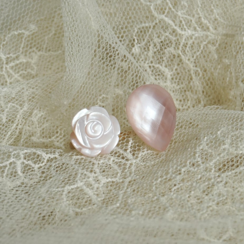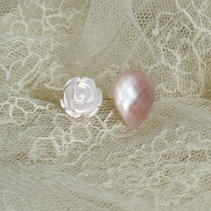 薔薇型のストーンはピンクシェル。ナチュラルな光沢が、持ち主を優しく包み込むような優しい輝きを放ちます。